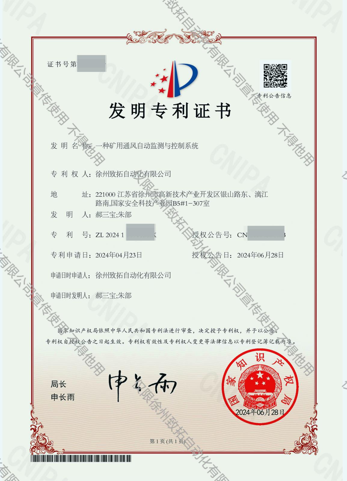 • 喜報!徐州致拓自動化《一種礦用通風自動監測與控制系統》獲得國家發明專利證書!